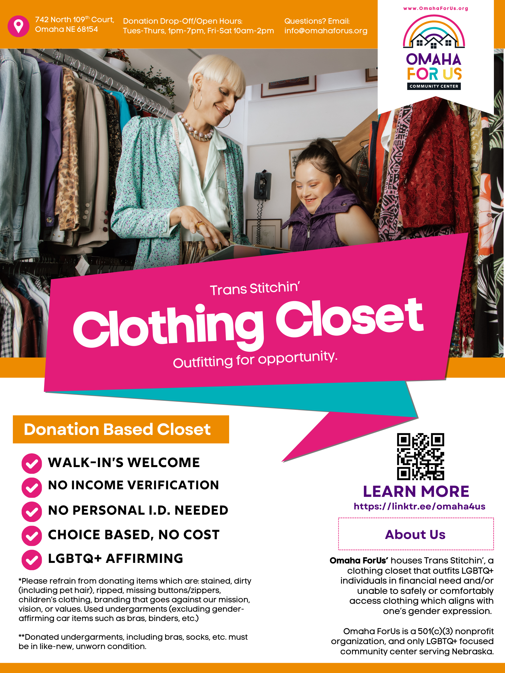 To host an in-kind fundraiser for supplies for Omaha ForUs’ clothing closet or food/hygiene pantry, consider downloading or printing the flyers below.
